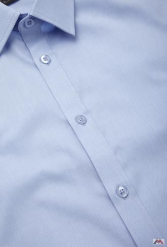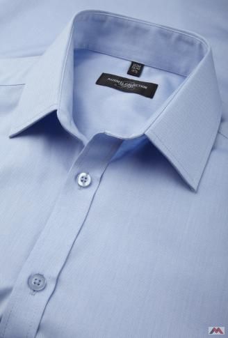 Klasszikus szabású, testhezálló fazonú, kiváló minőségű kék rövid ujjú ing kevertszálas anyagból félig levágott gallérral